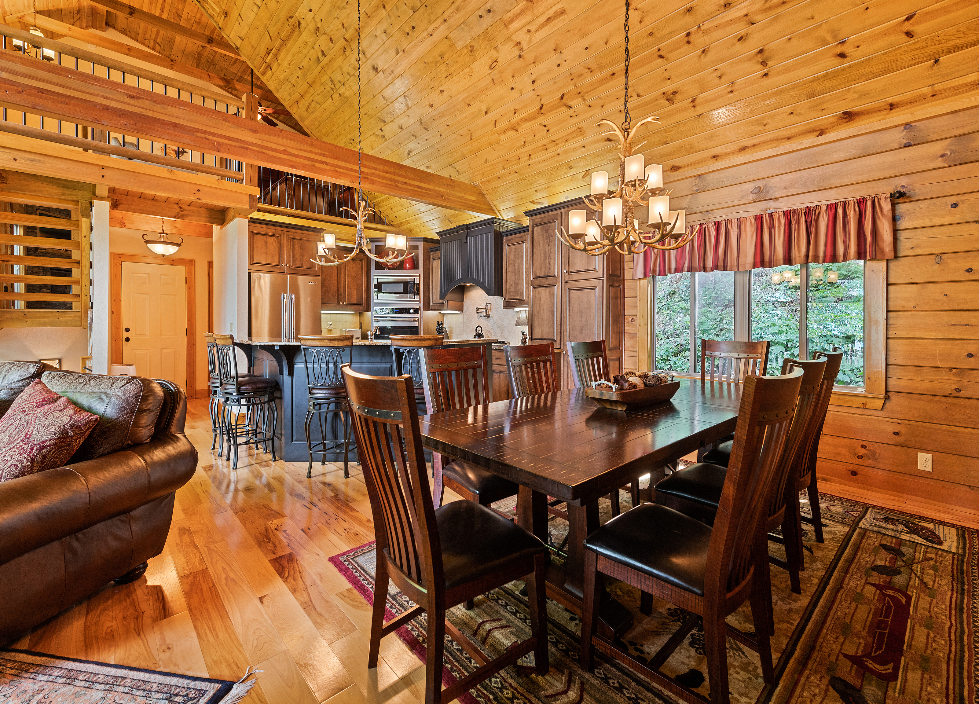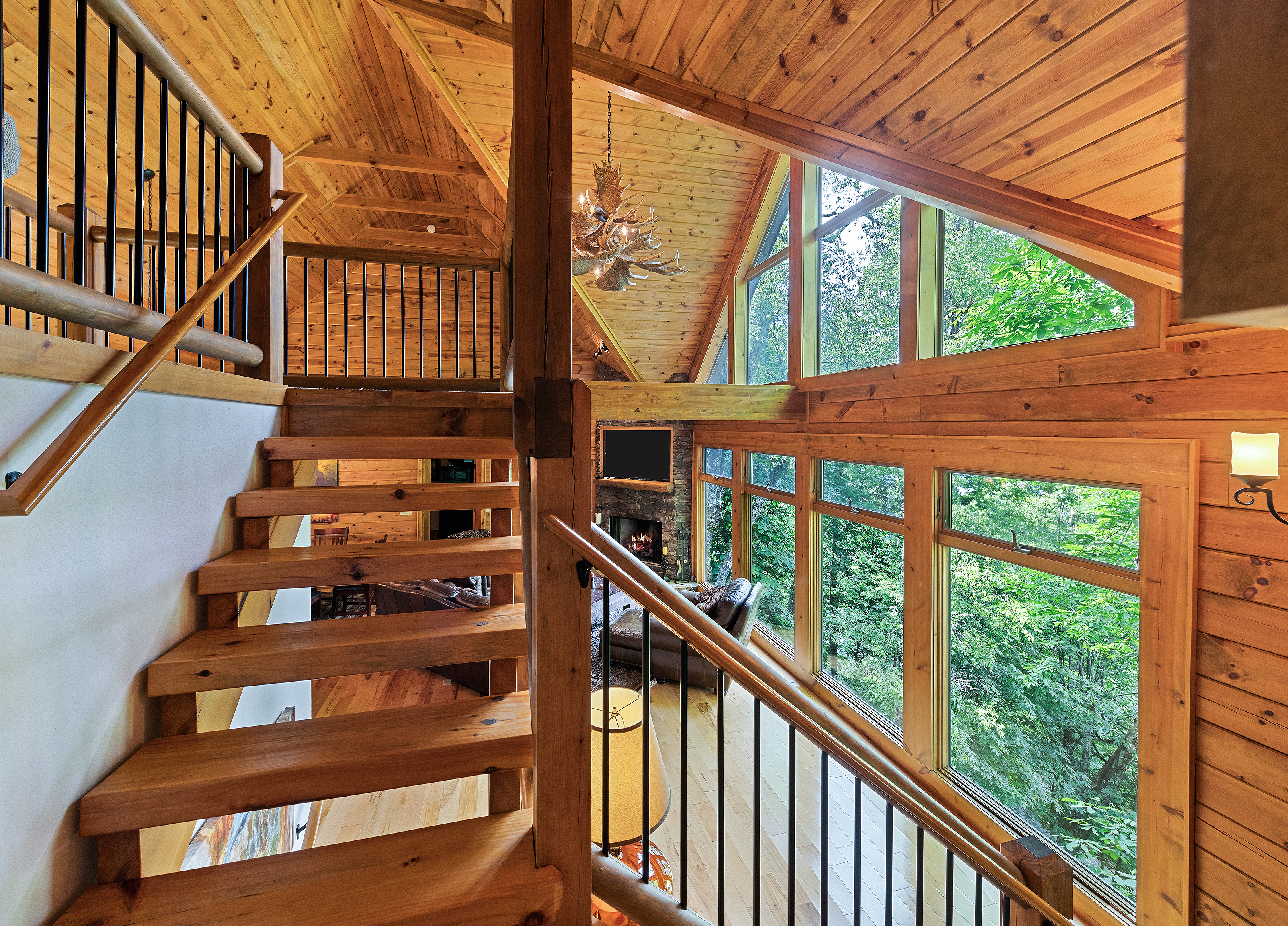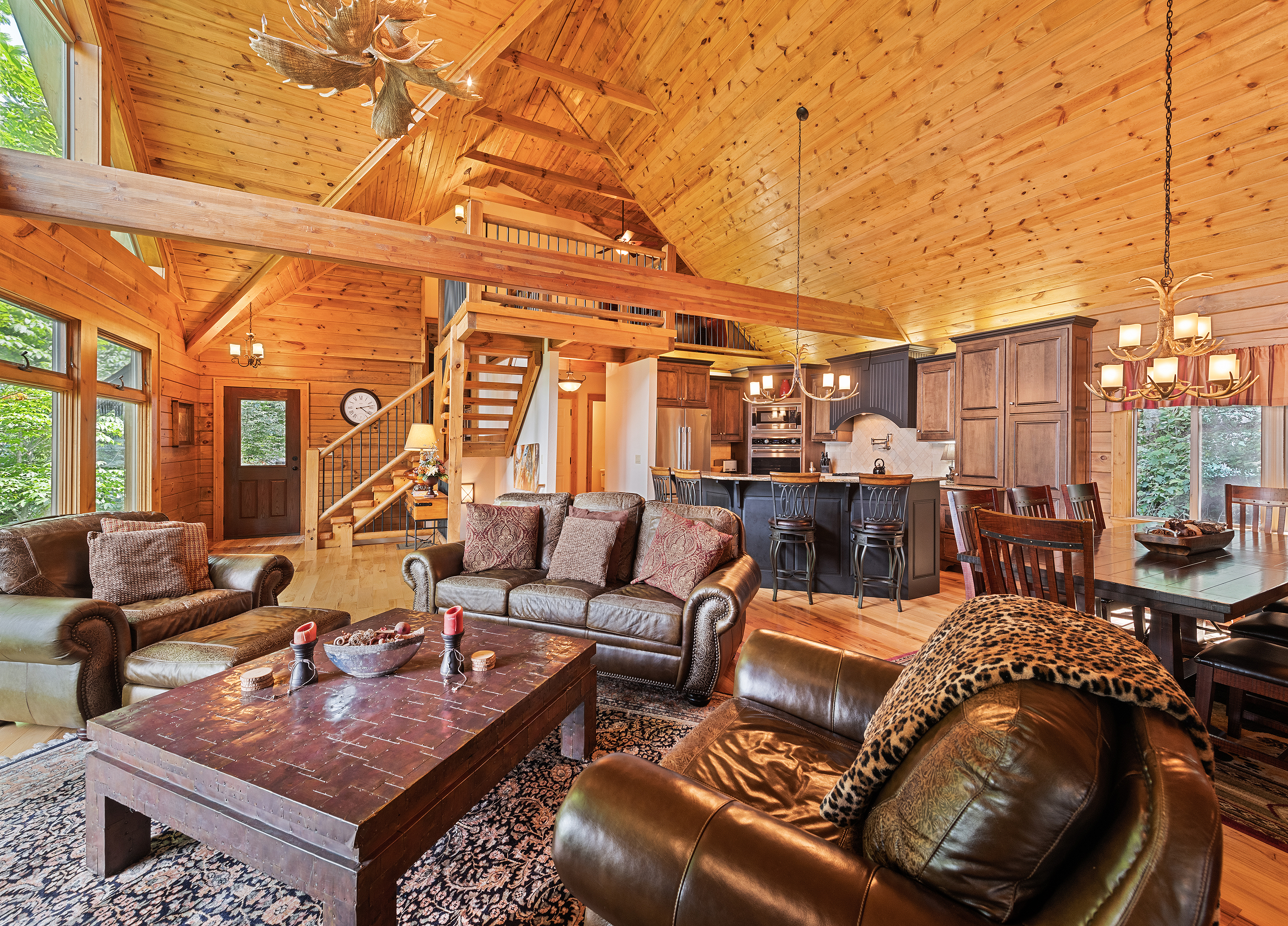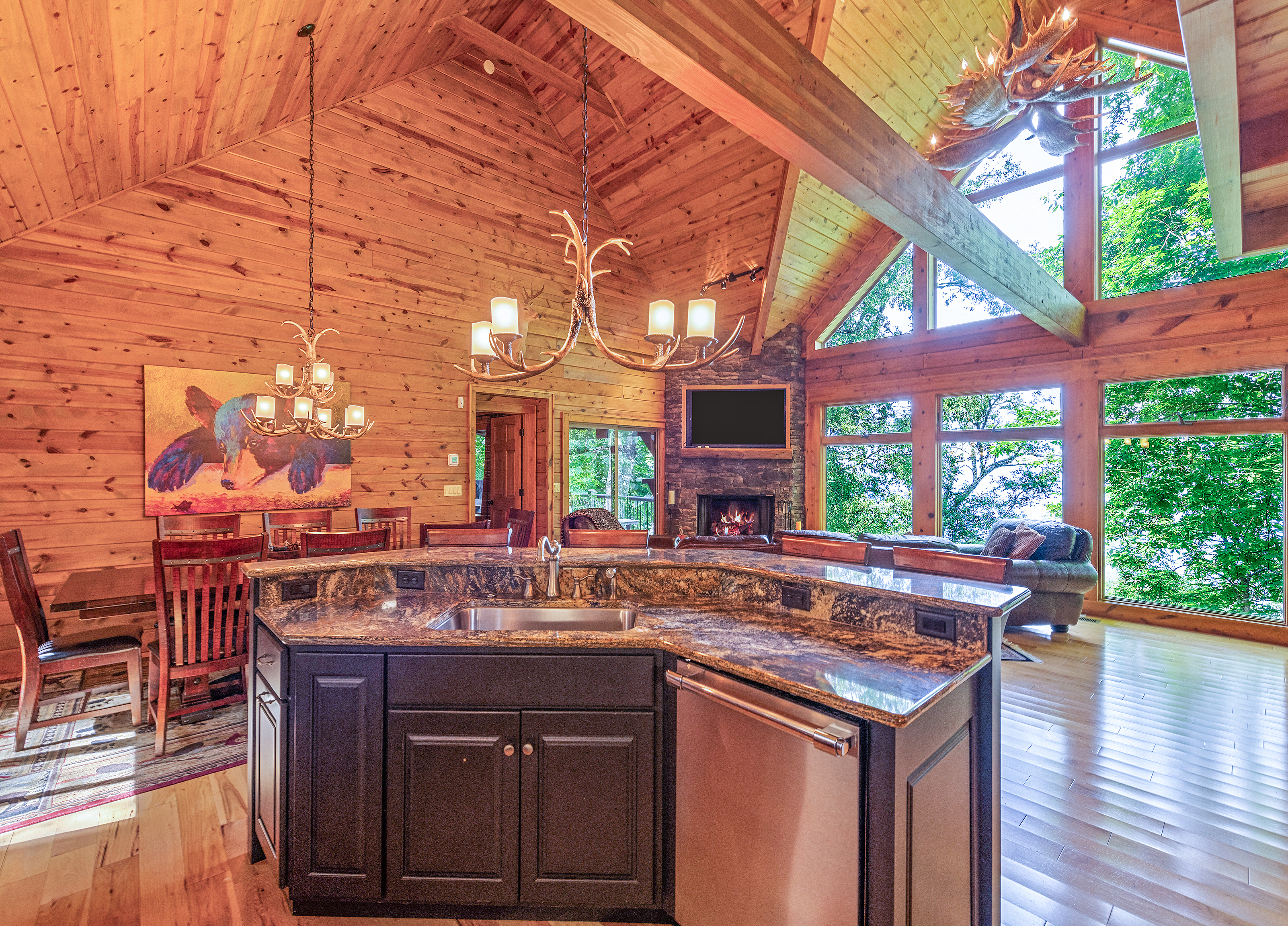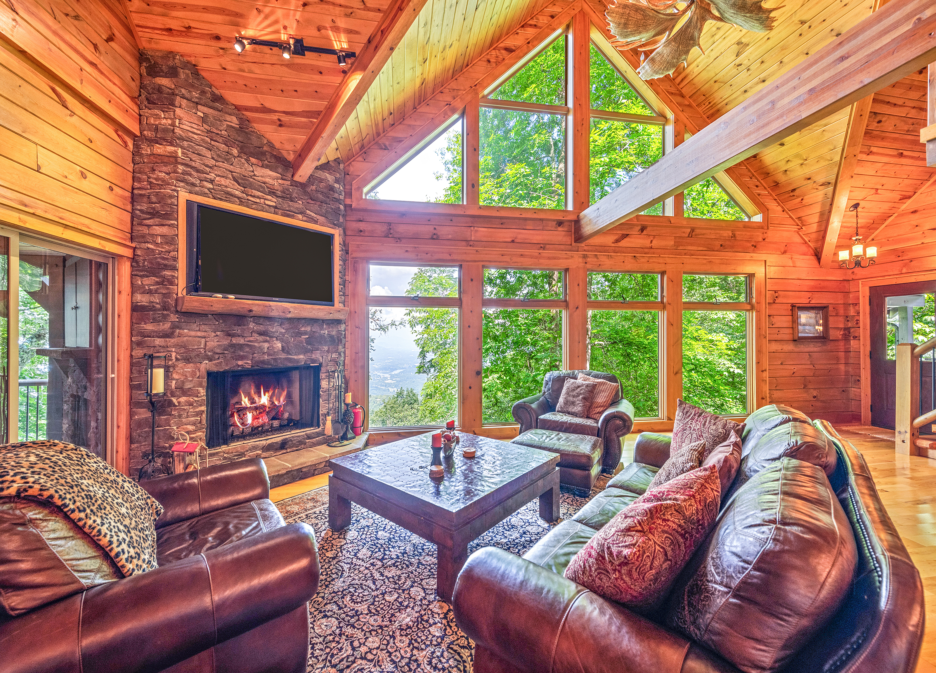 With 3600 sq ft of living space and 1200 sq ft of outdoor decks, "Peace" of Heaven sleeps 10 w/4 bedrooms, 31/2 baths including 2 luxurious master suites on main level both with ensuite baths and walk-in closets; 2 bedrooms downstairs; 4 fireplaces, 1 log and 3 gas; 7 flat screens with Direct TB Satellite; central air and heat; floor to ceiling glass views upper and lower levels. 4 levels including loft with office and sleeper sofa. All bedrooms have speed control fans. Solid pine floors main level and very plush carpet on lower level and loft. 2 car garage with paved driveway.