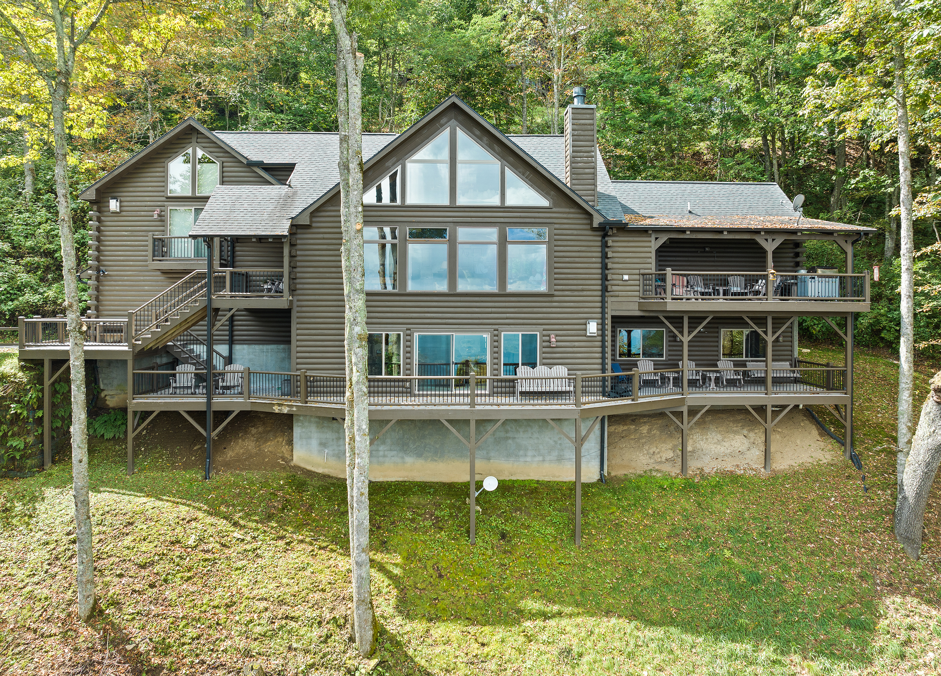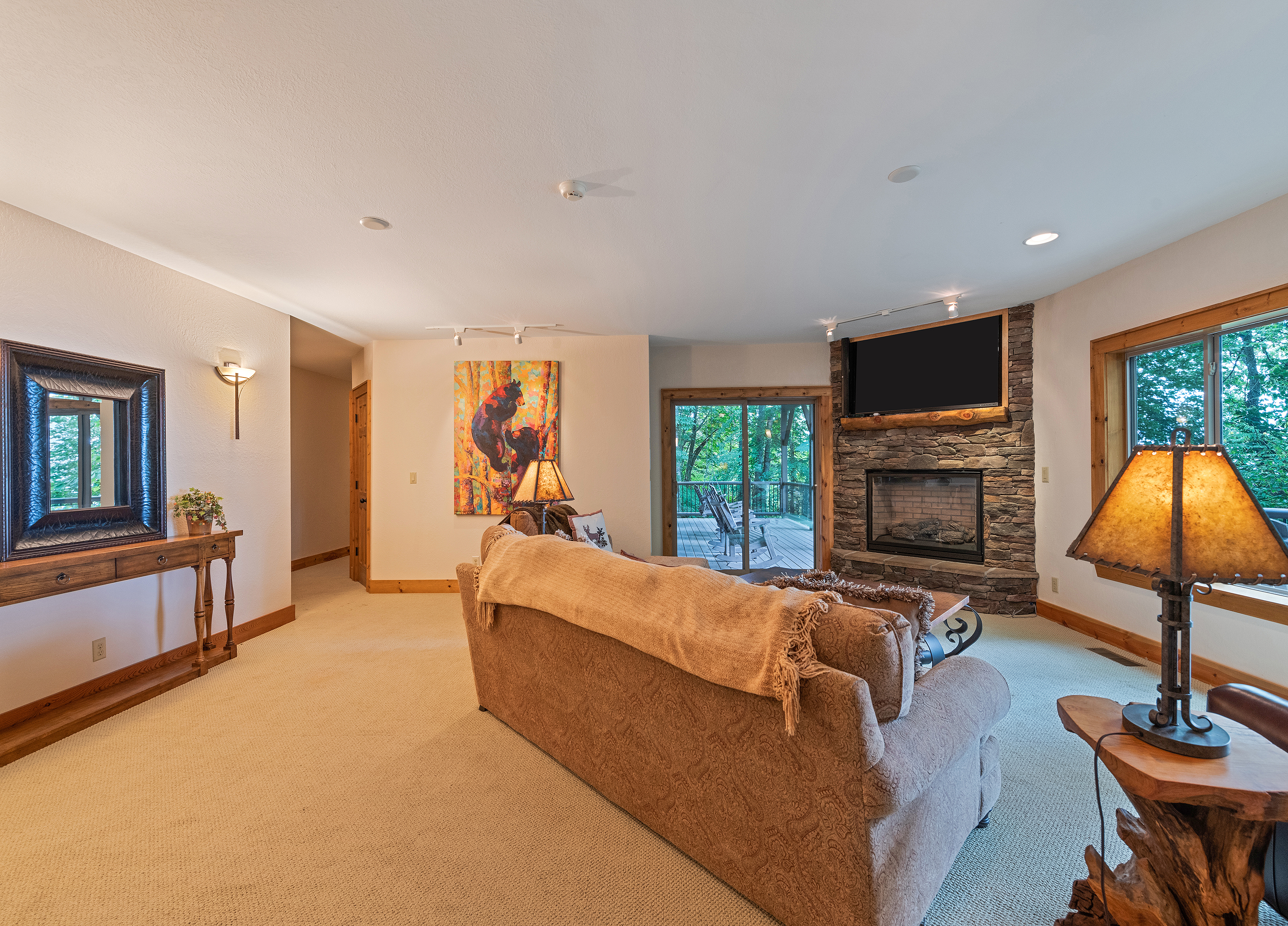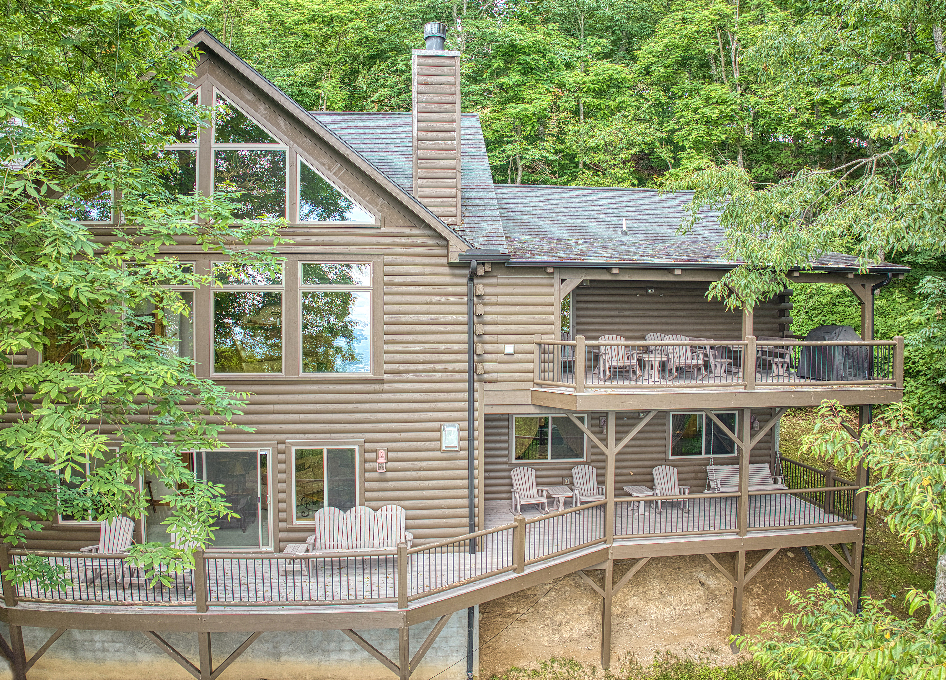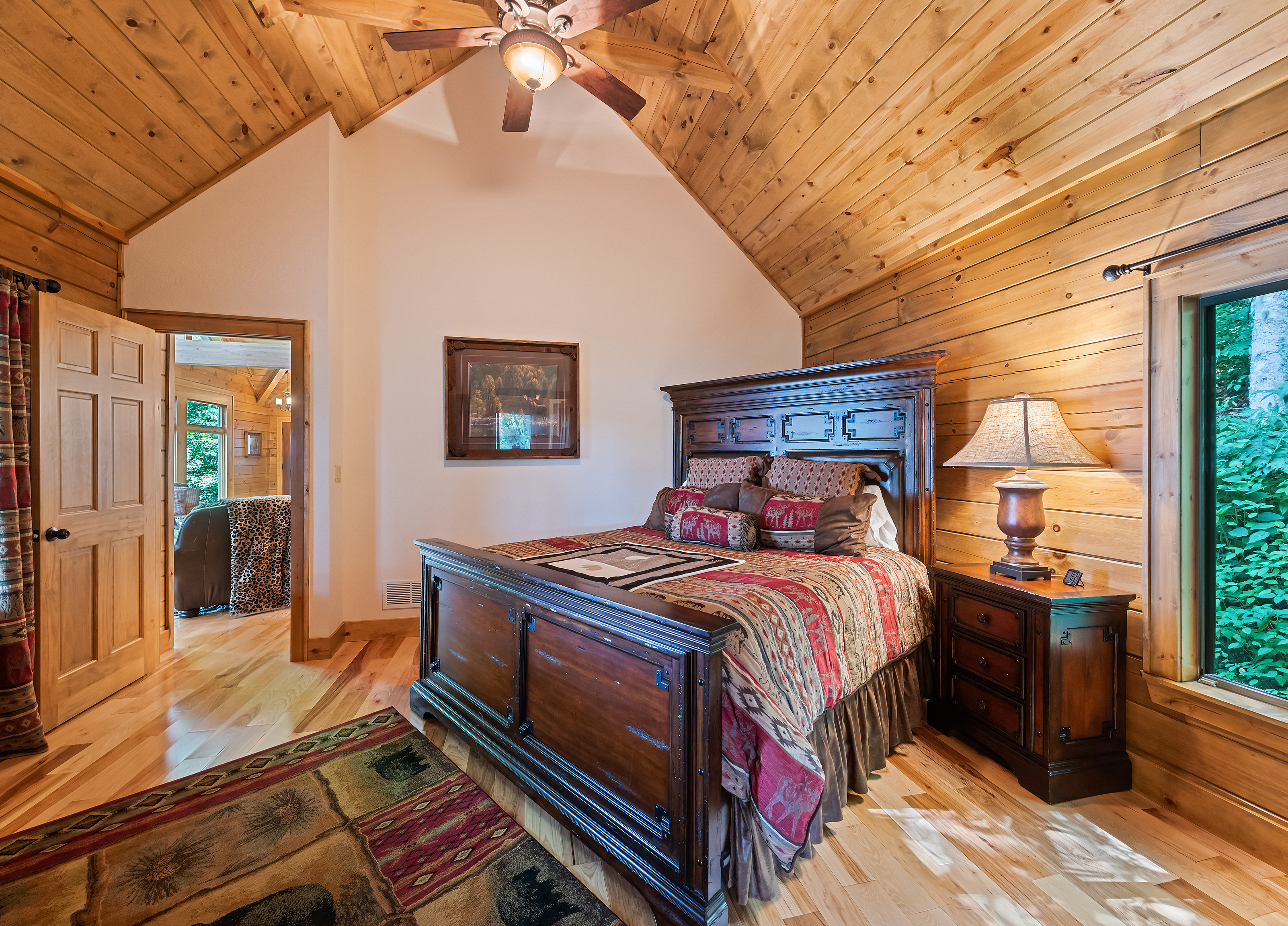 With 3600 sq ft of living space and 1200 sq ft of outdoor decks, "Peace" of Heaven sleeps 10 w/4 bedrooms, 31/2 baths including 2 luxurious master suites on main level both with ensuite baths and walk-in closets; 2 bedrooms downstairs; 4 fireplaces, 1 log and 3 gas; 7 flat screens with Direct TB Satellite; central air and heat; floor to ceiling glass views upper and lower levels. 4 levels including loft with office and sleeper sofa. All bedrooms have speed control fans. Solid pine floors main level and very plush carpet on lower level and loft. 2 car garage with paved driveway.