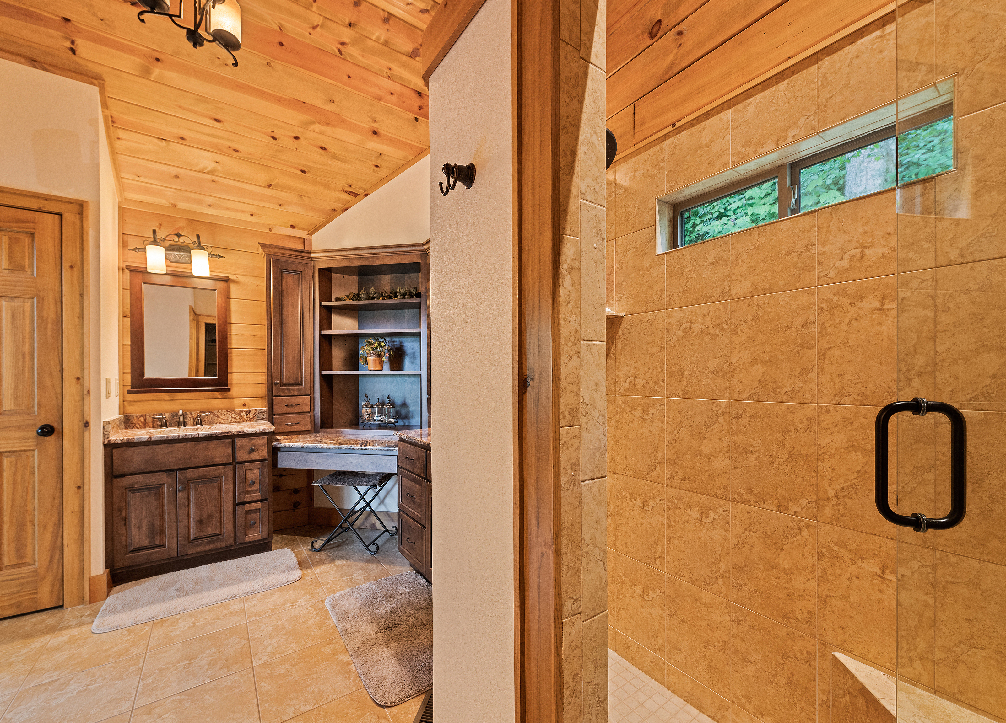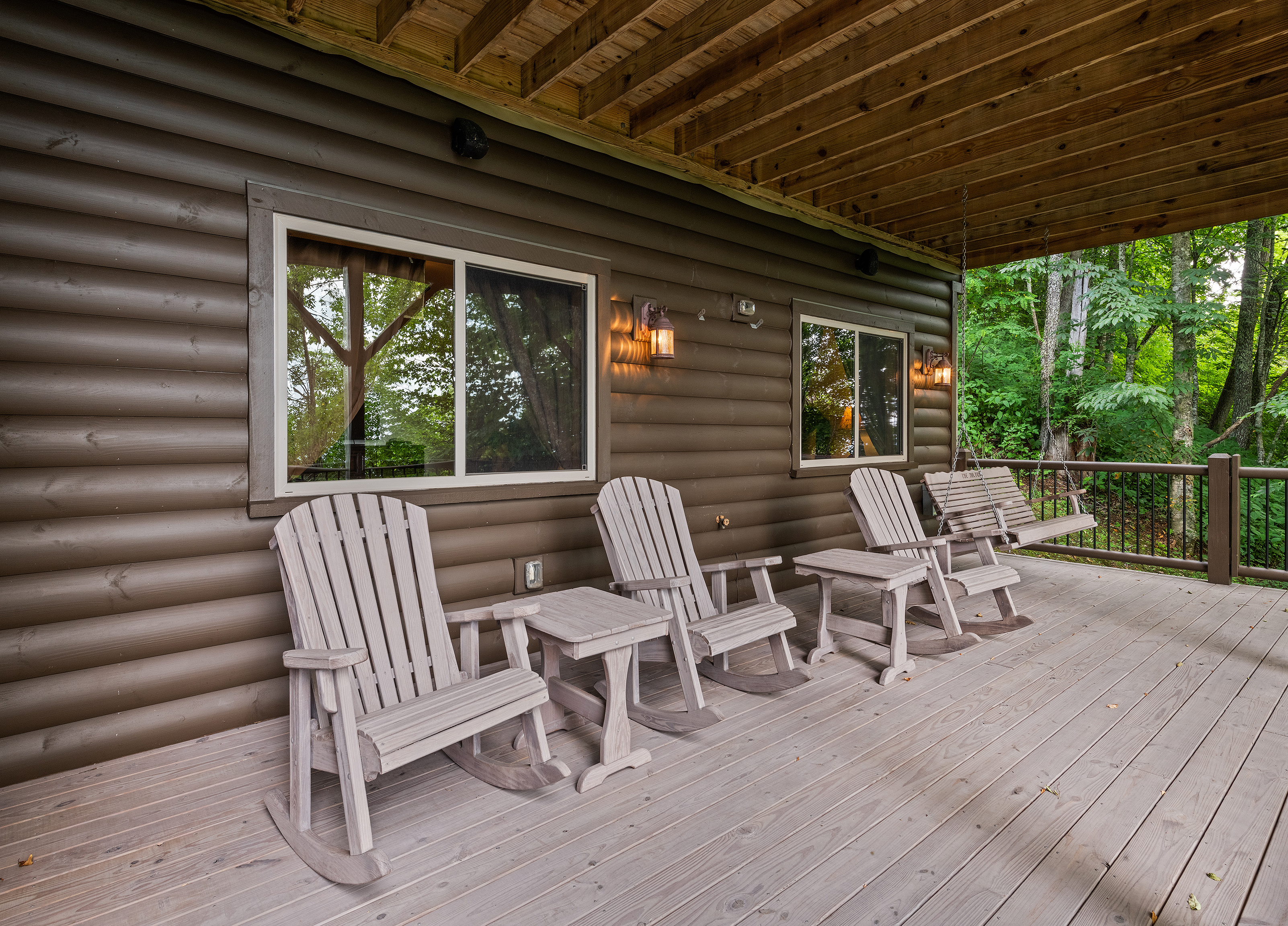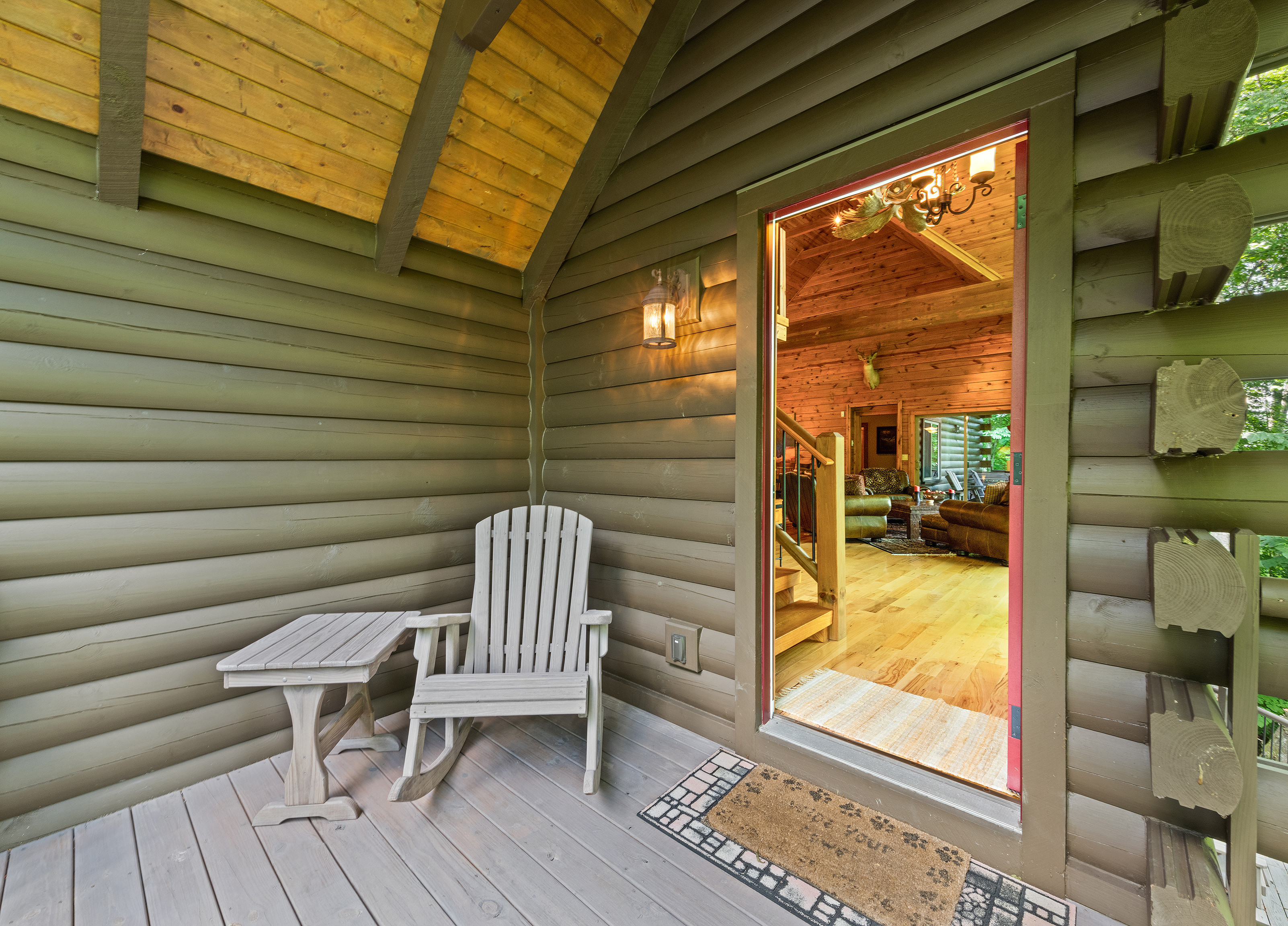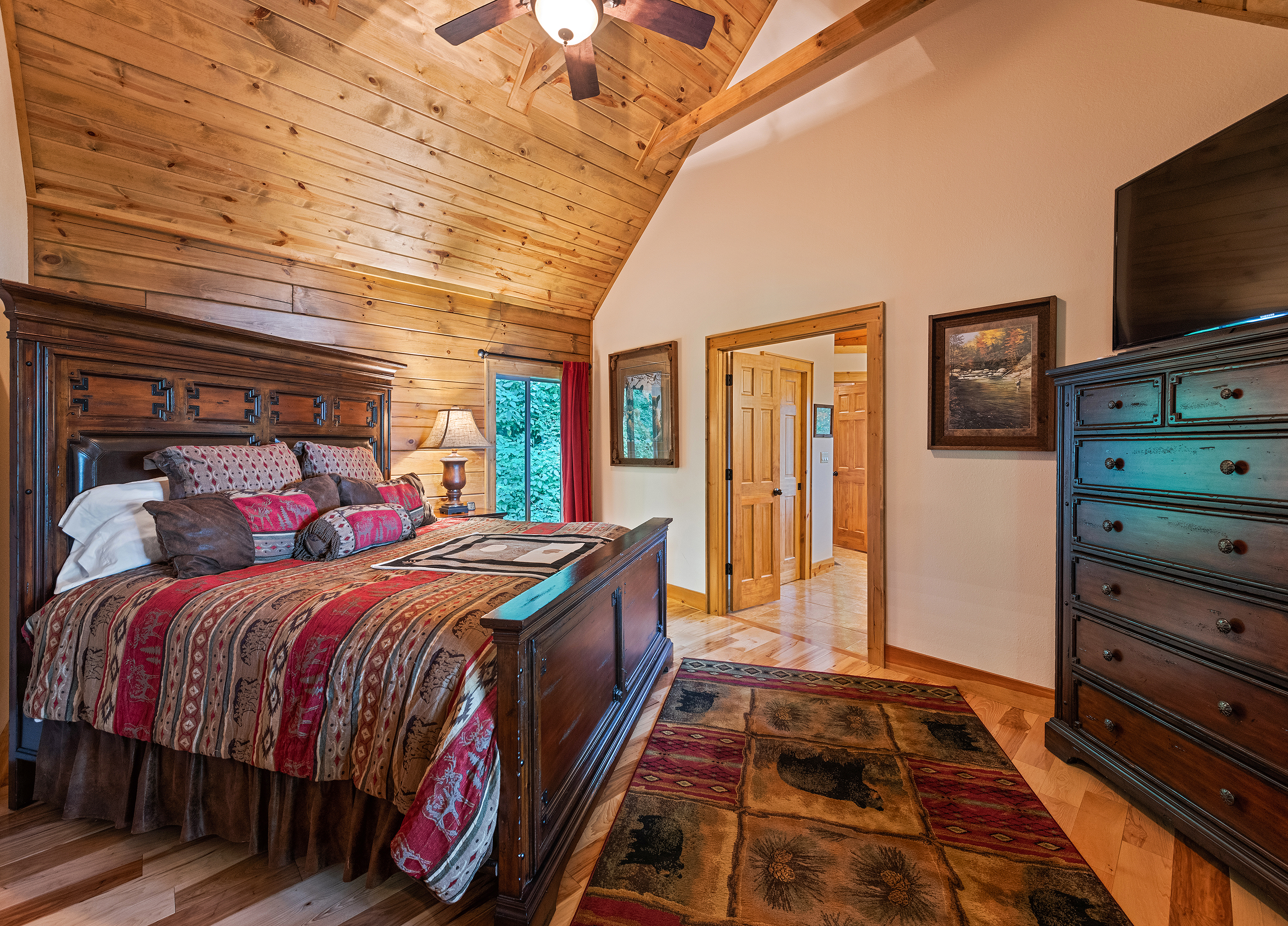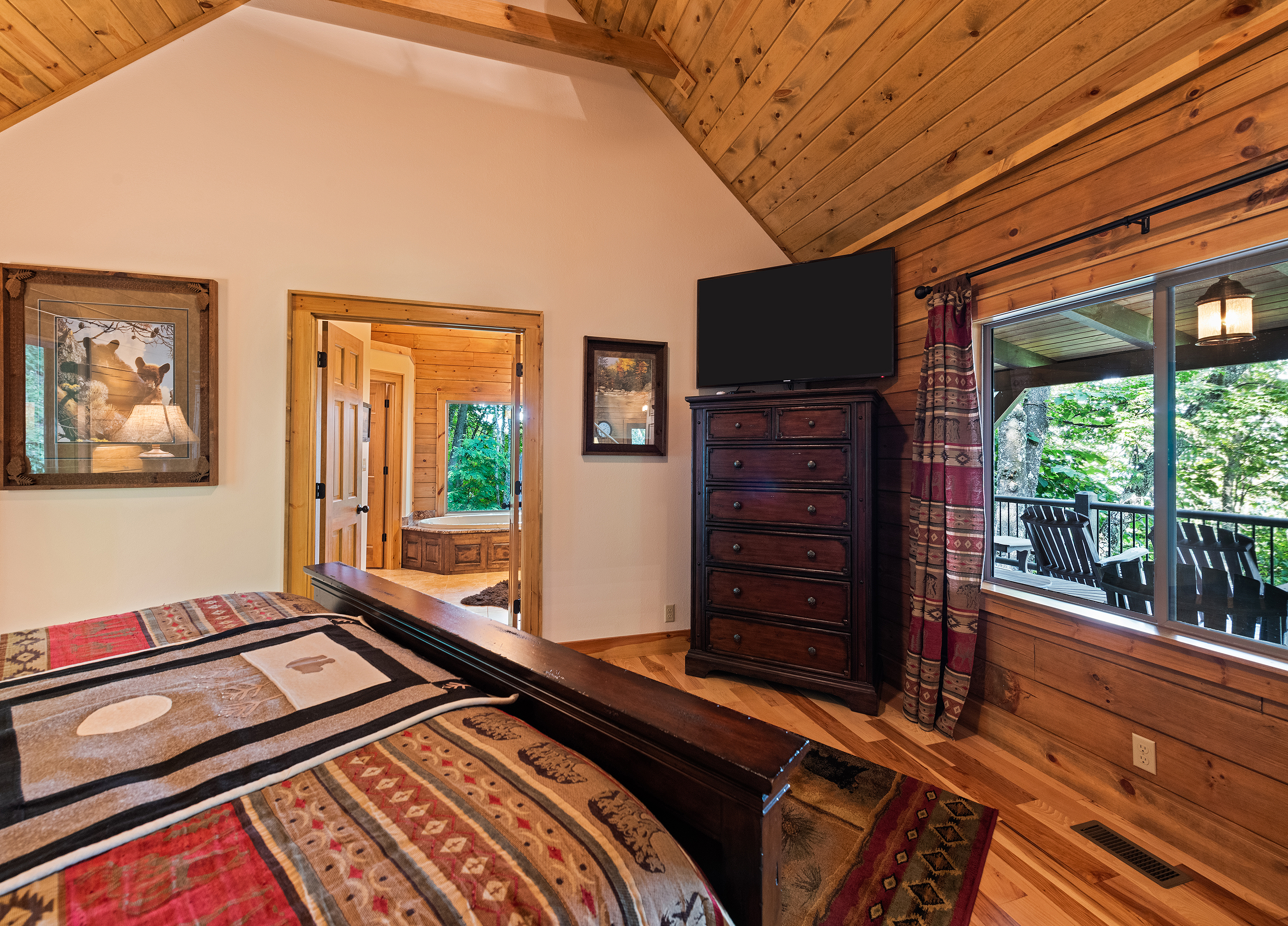 With 3600 sq ft of living space and 1200 sq ft of outdoor decks, "Peace" of Heaven sleeps 10 w/4 bedrooms, 31/2 baths including 2 luxurious master suites on main level both with ensuite baths and walk-in closets; 2 bedrooms downstairs; 4 fireplaces, 1 log and 3 gas; 7 flat screens with Direct TB Satellite; central air and heat; floor to ceiling glass views upper and lower levels. 4 levels including loft with office and sleeper sofa. All bedrooms have speed control fans. Solid pine floors main level and very plush carpet on lower level and loft. 2 car garage with paved driveway.