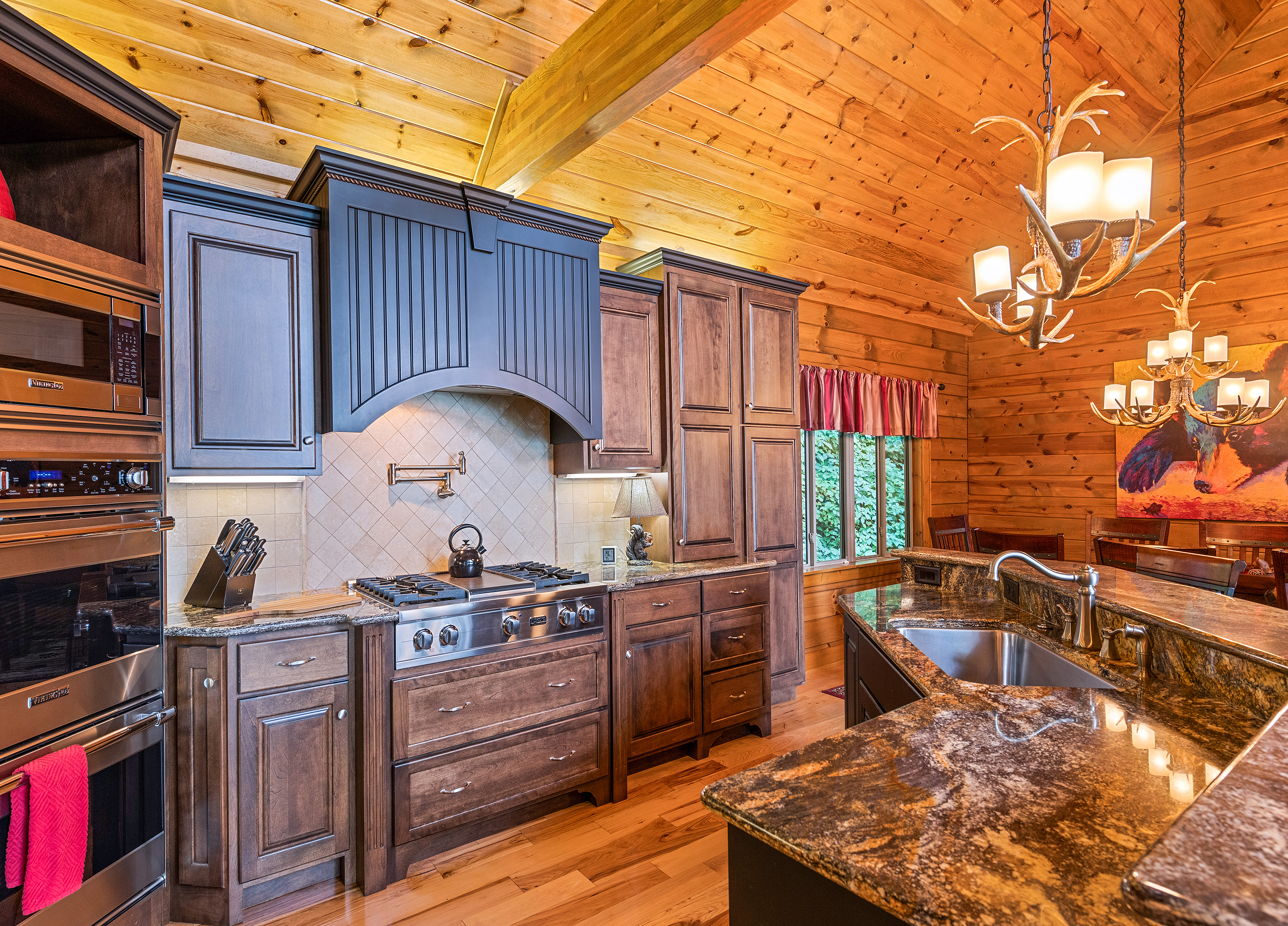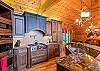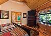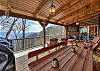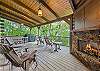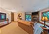 1st Floor: Living rm w/high end leather furniture w/wood burning fireplace; 60" LED flat screen TV; Dining room seats 10; Deck off living area has 4 rockers, wood dining table seats 10 for outdoor dining, 5 burner gas barbeque, stone fireplace and a 50' built-in flat screen TV. Well appointed kitchen has Level 6 granite countertops with breakfast bar and Viking appliances: double oven, double door refrig. microwave and dishwasher. Gas stove with center grille. Half Bath, utility room with high quality washer/dryer. King Master bedroom with ensuite bath features a large shower, soaking tub, double sinks and vanity. Walk-in closet. 55" LED flat screen TV.
