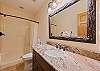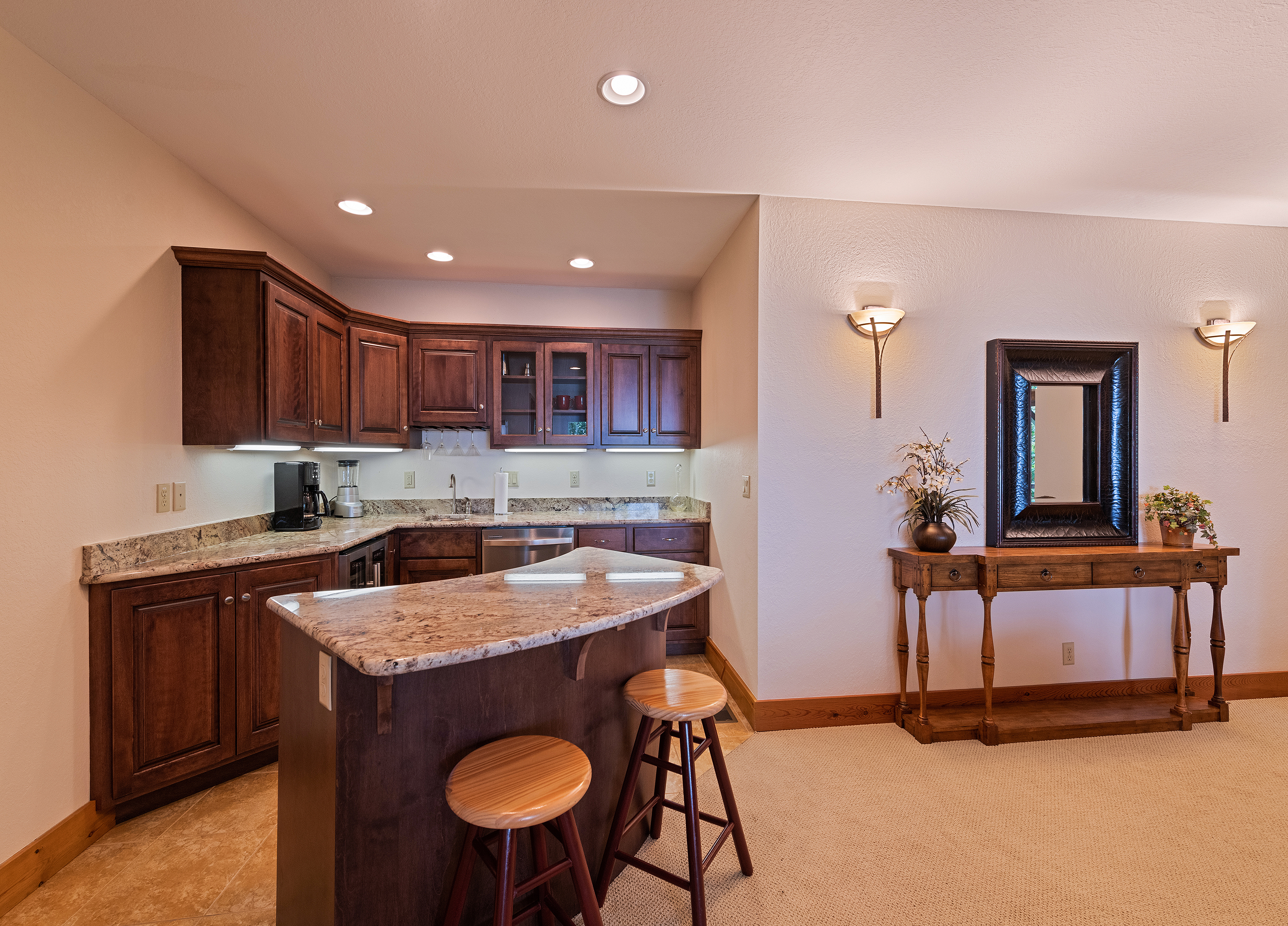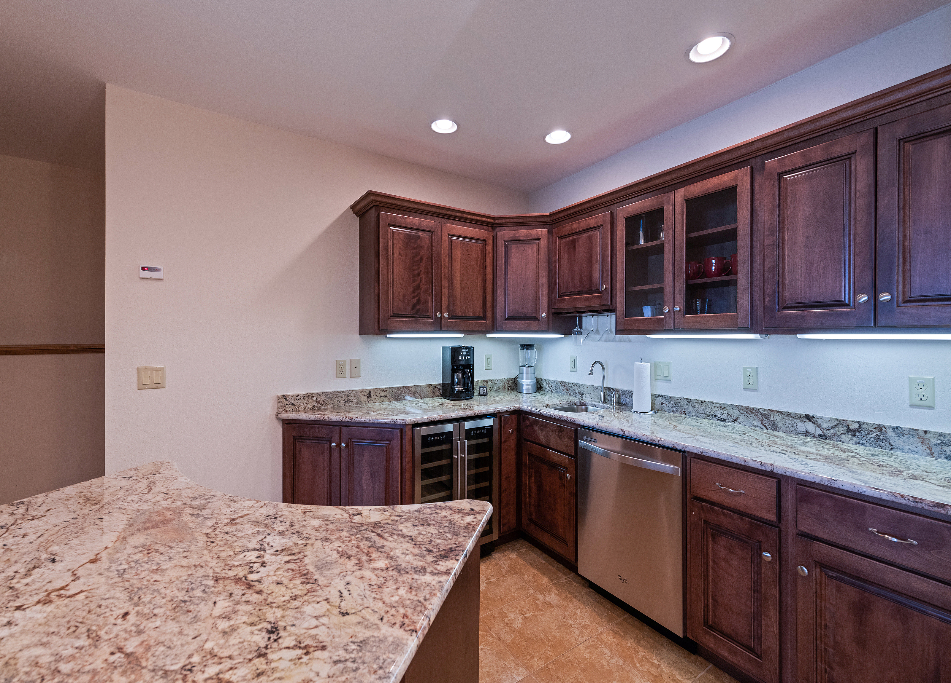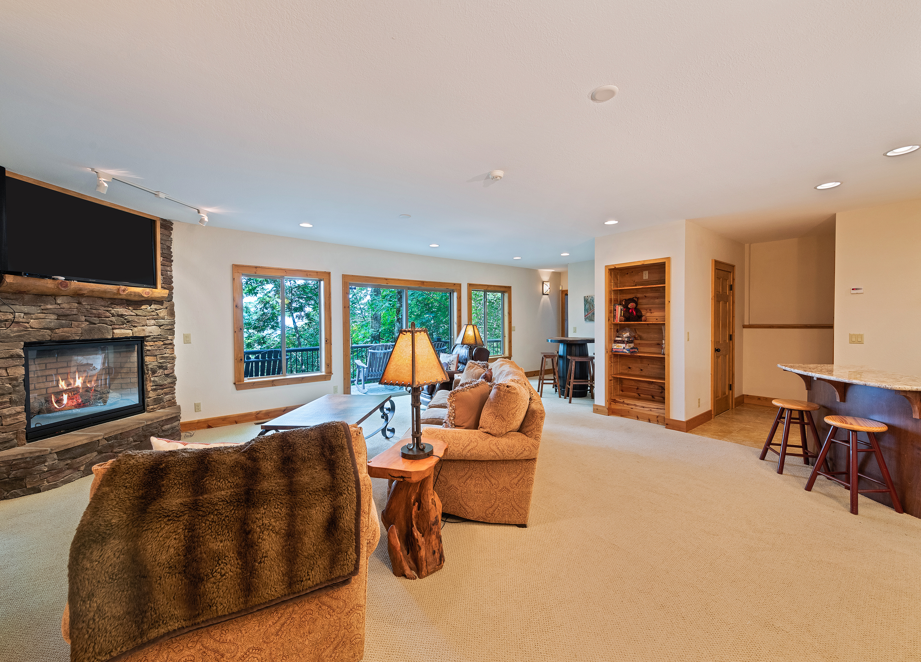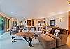 Lower Level: Entertainment/Family room-Featuring beautiful high-end furniture with 60" LED flat screen TV and oversized gas fireplace; Bar area featuring a serving island with cabinets, Level 6 granite; dishwasher; and red and white temperature controlled wine refrigerators. 2 bedrooms featuring Queen Bernhardt beds and dressers, 40" flat screen TV in one and 32" flat screen in the other. Full bathroom. Home is equipped with 911 direct call system for fire and security.