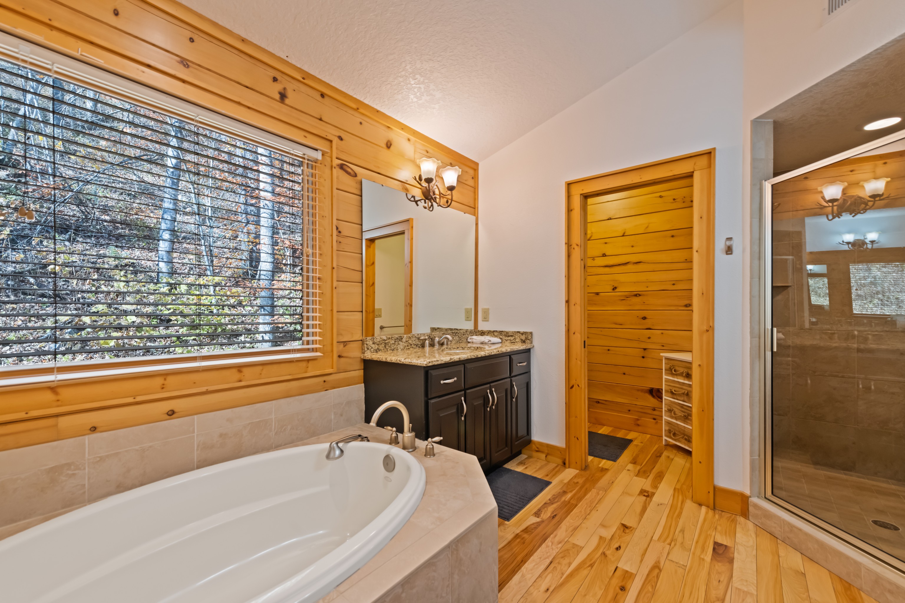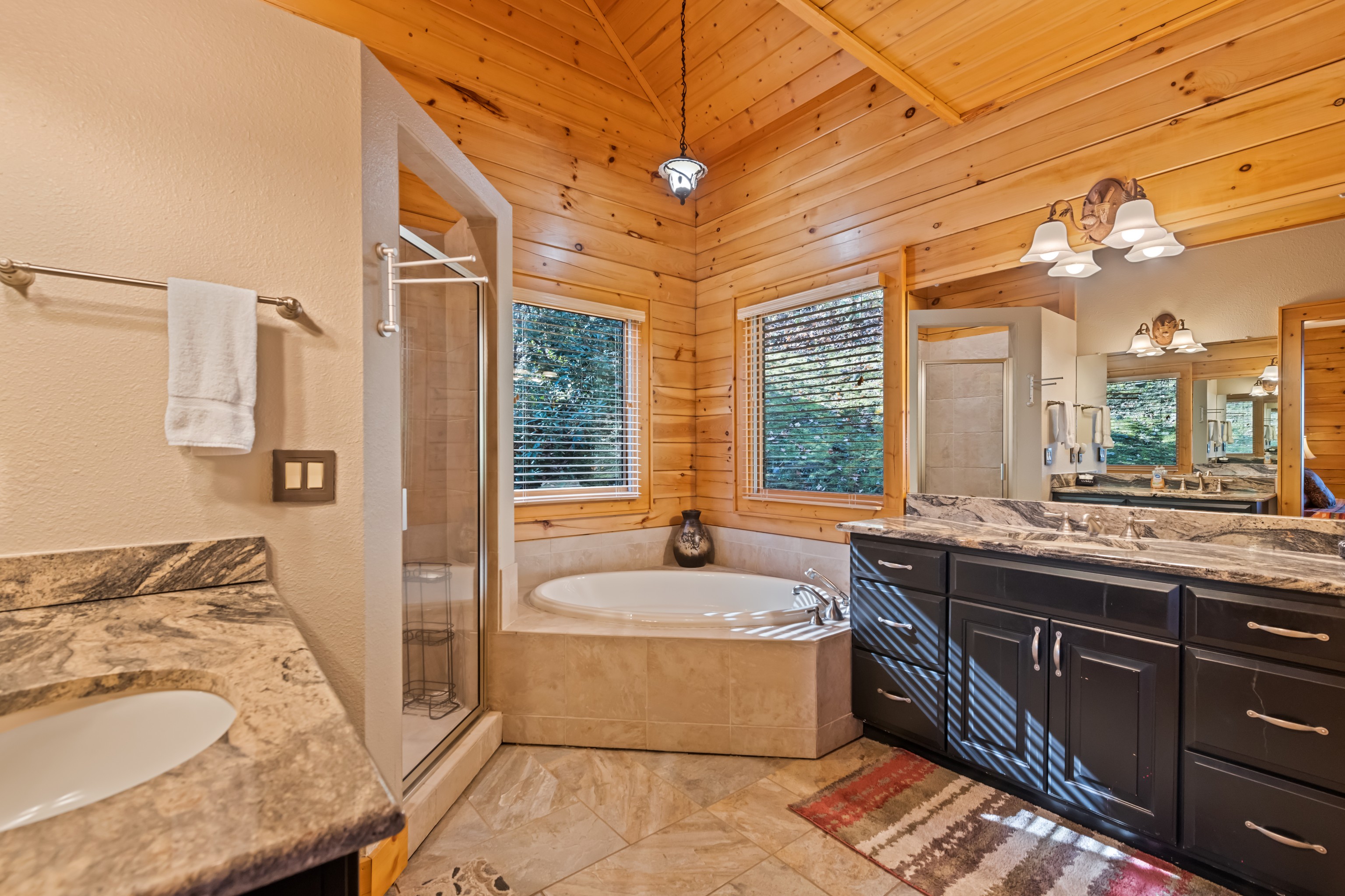 1st Floor: Living Room, Kitchen, Wood Fireplace, Stainless steel appliance, Dining Room table for 4, Covered porch with dining table for 6, breakfast bar, spacious kitchen, Master King bedroom with full bathroom, garden tub, walk-in shower