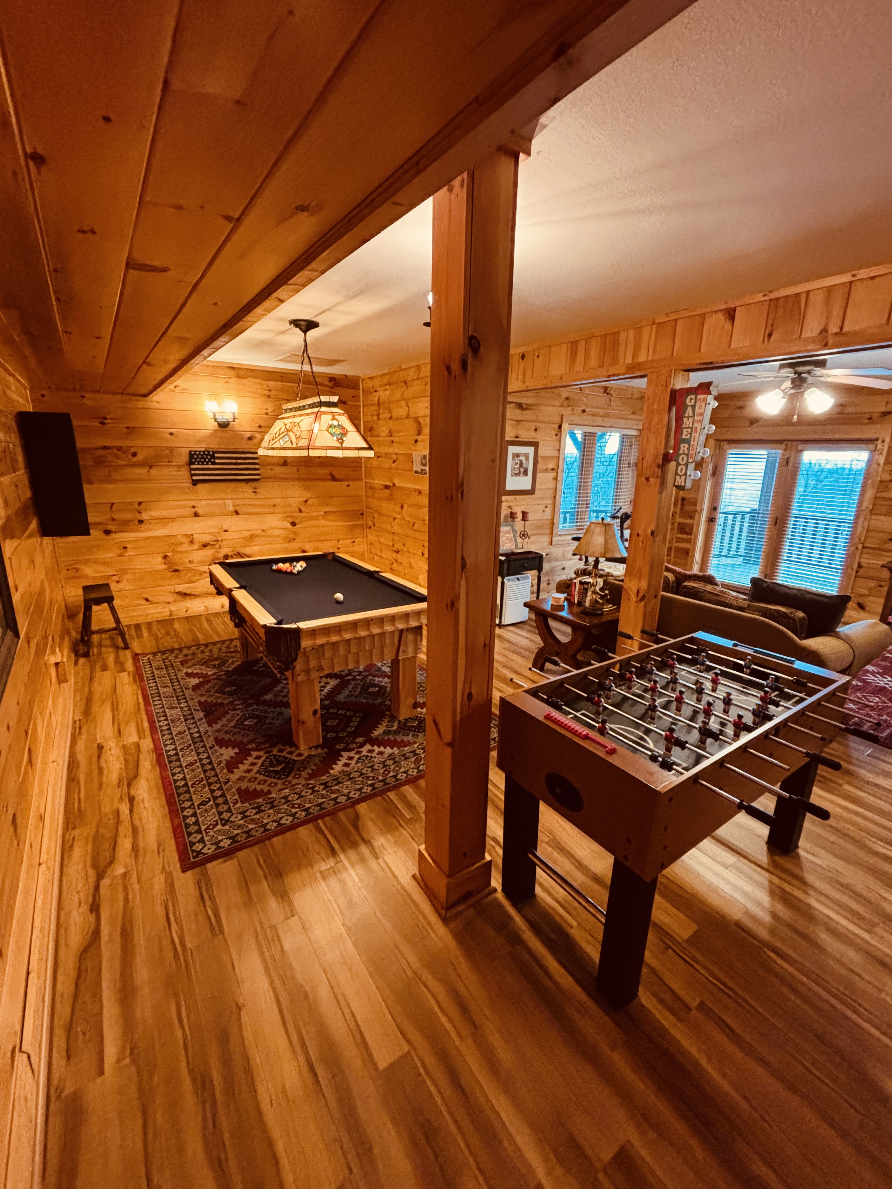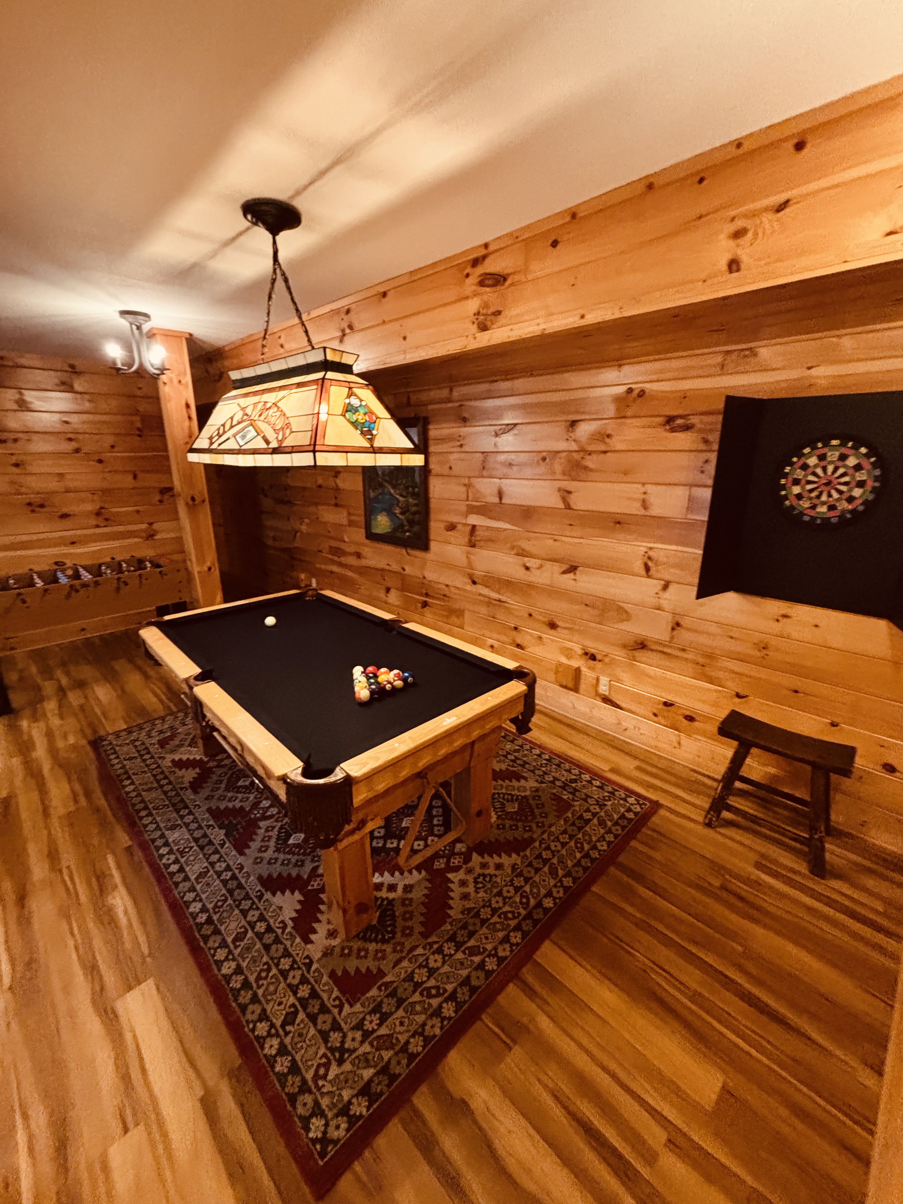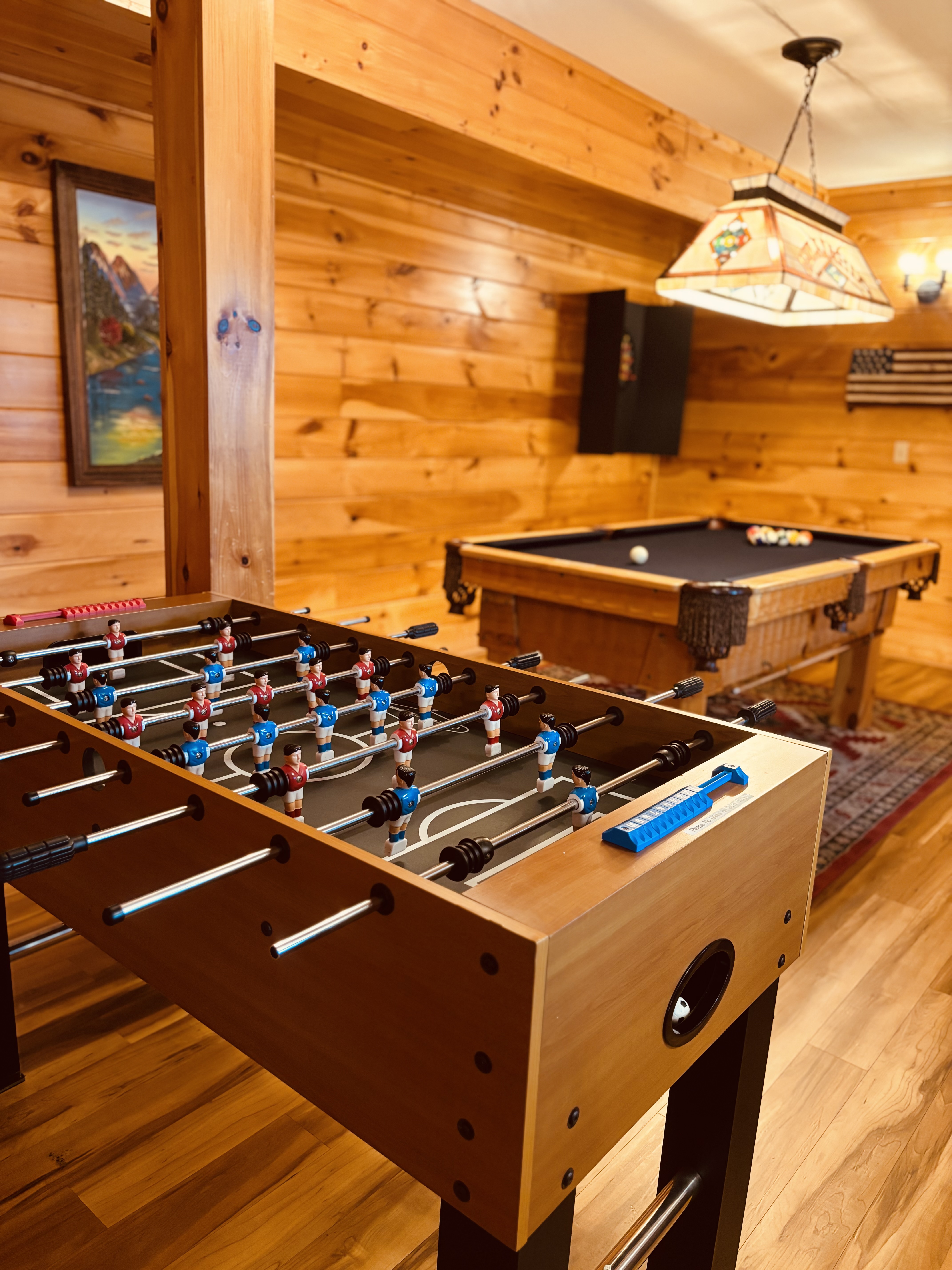A beautiful downstairs area includes a third bedroom with two twin beds, a full bath with a shower tub, and a game room that has something for every guest including a 55" Smart TV, billiard table and foosball table. Wireless High-Speed Internet is accessible and reliable throughout the entire cabin! Roku devices on each TV feel free to use your streaming accounts!