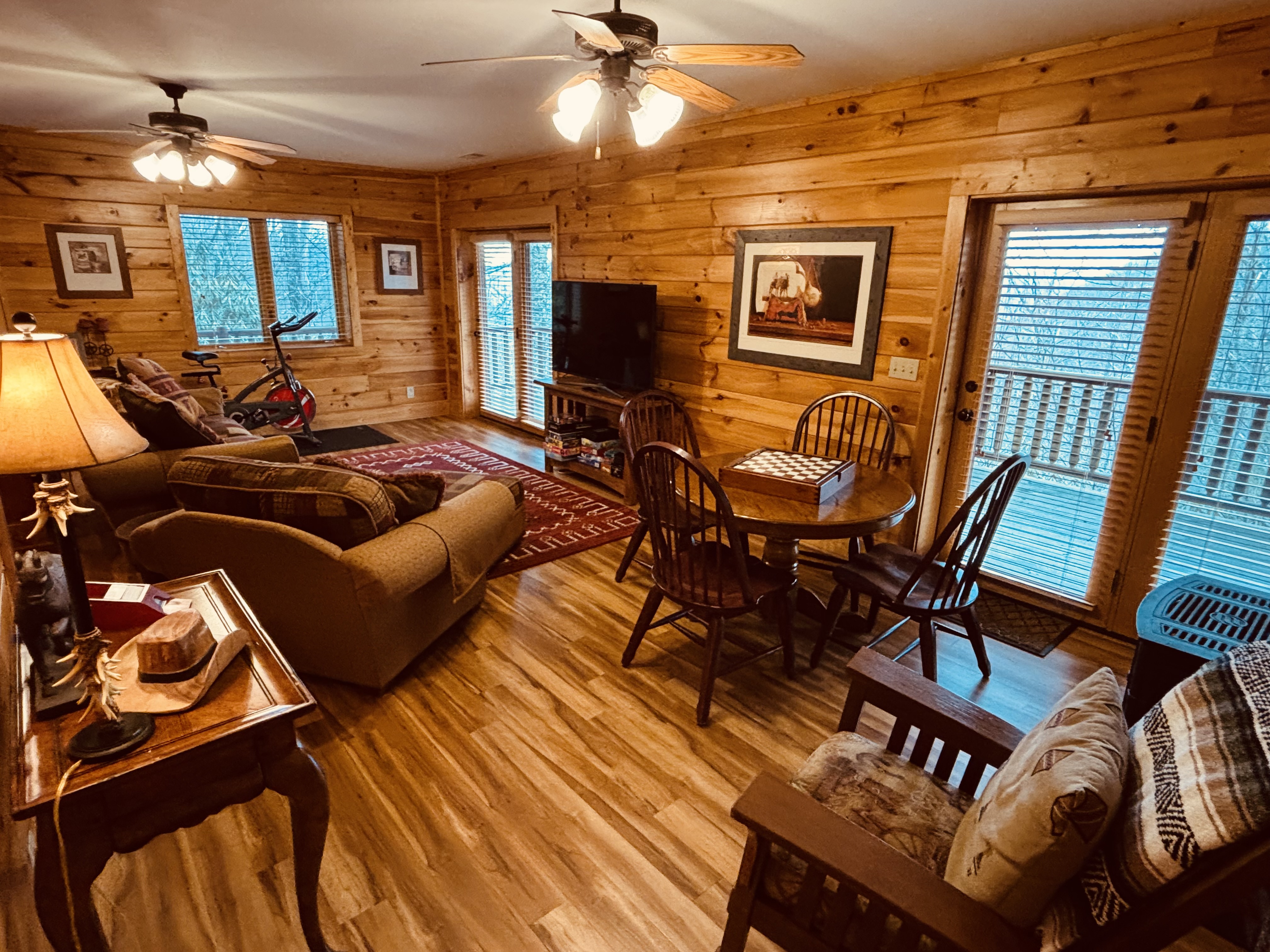 Fantastic view from the balcony. The kitchen was well equipped. The beds were comfortable.The cabin was fairly clean. Better seating is needed on the main floor. Such as a couple of recliners would be nice.Amd some brighter lighting would be nice. One rug in the.dining room should be repaired or replaced. Overall a very nice cabin.